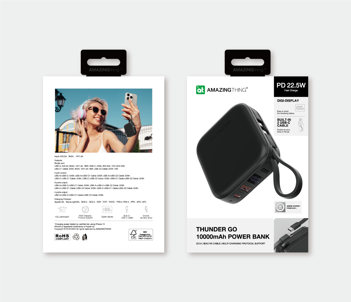 AMAZINGTHING PD 22.5W 10000mAh Portable Power Bank with Built-in Cable - THUNDER GO Series
