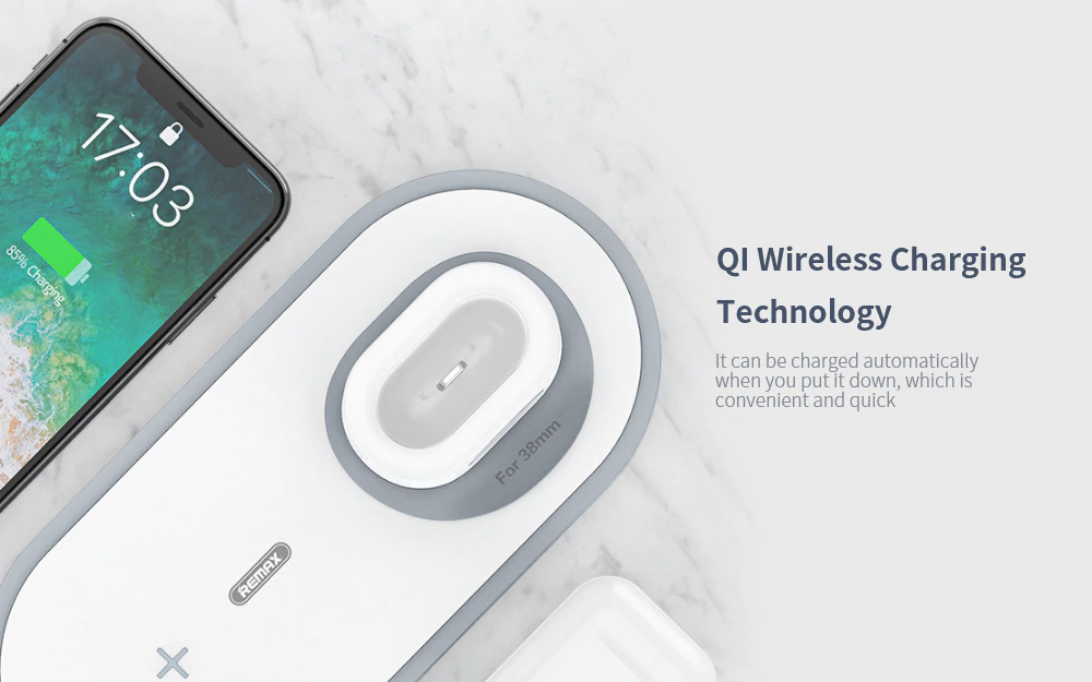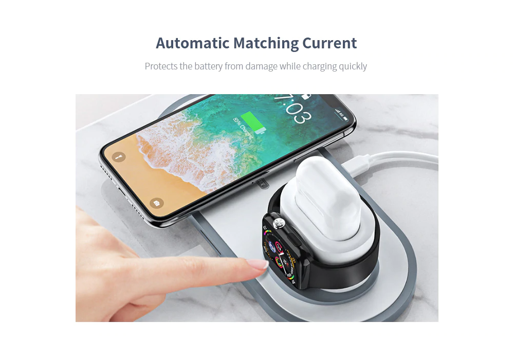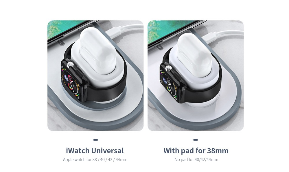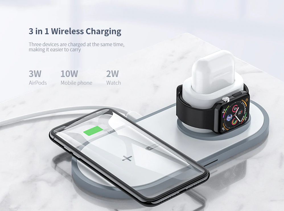 - Three-In-One Wireless Charging Station, Charging your iPhone (iPhone 8 or Above), iWatch( 38/40/42/44 MM ) , AirPods (1/2 Gen ) at the Same Time.